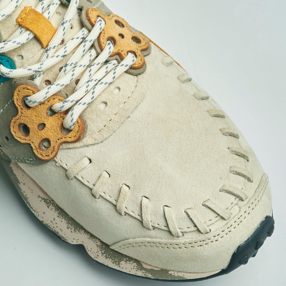 ハンドメイドによるレザーストラップのモカシンや飾り穴の工作加工、自然をモチーフとした有機的なデザインディティールがバランスよく取り入れられブランドのコンセプトが体現されたフラワーマウンテンの原点の1足。