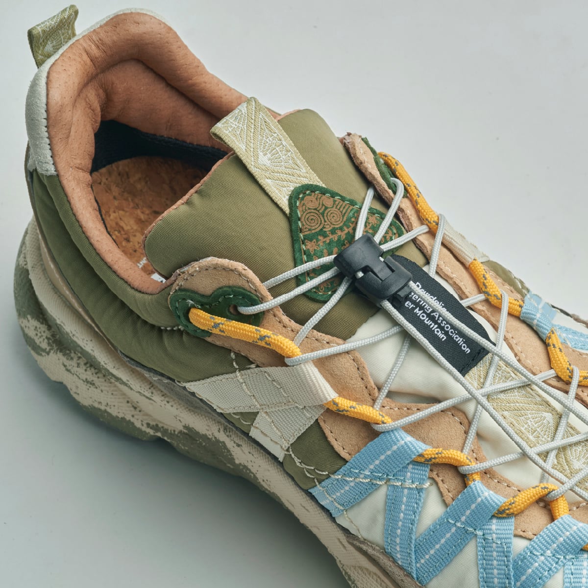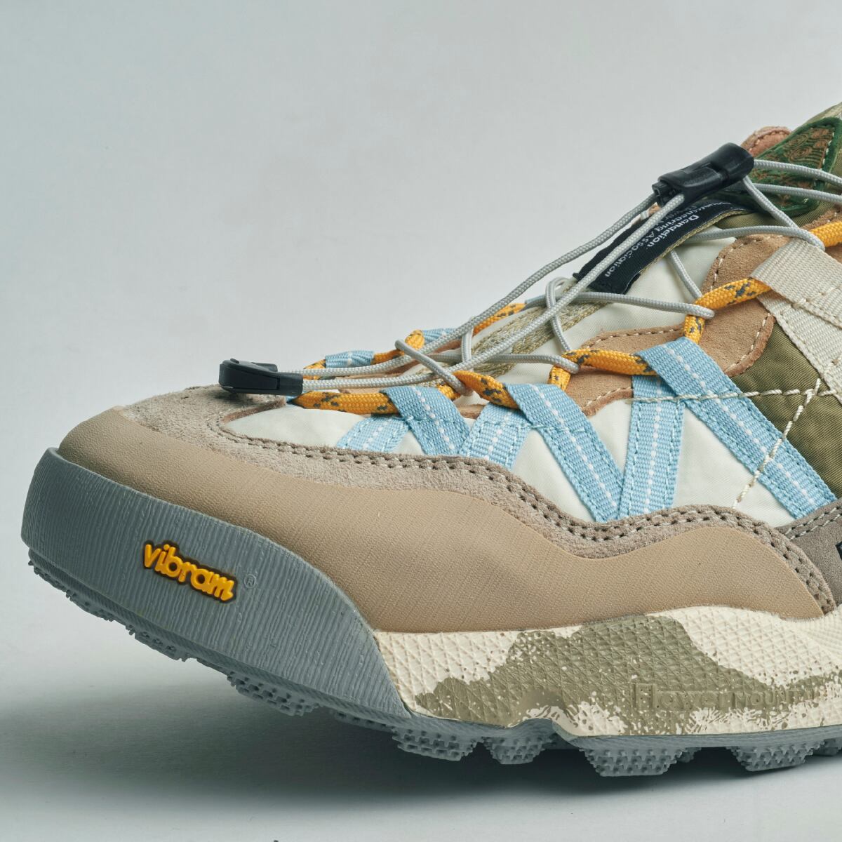 ソールには、悪路をものともしないVibram社の『MEGA GRIP』を採用し、Flower MOUNTAINオリジナルの設計と融合。岩場、ぬかるみ、乾いた路面――多様な環境に対応する確かなグリップ力を発揮。