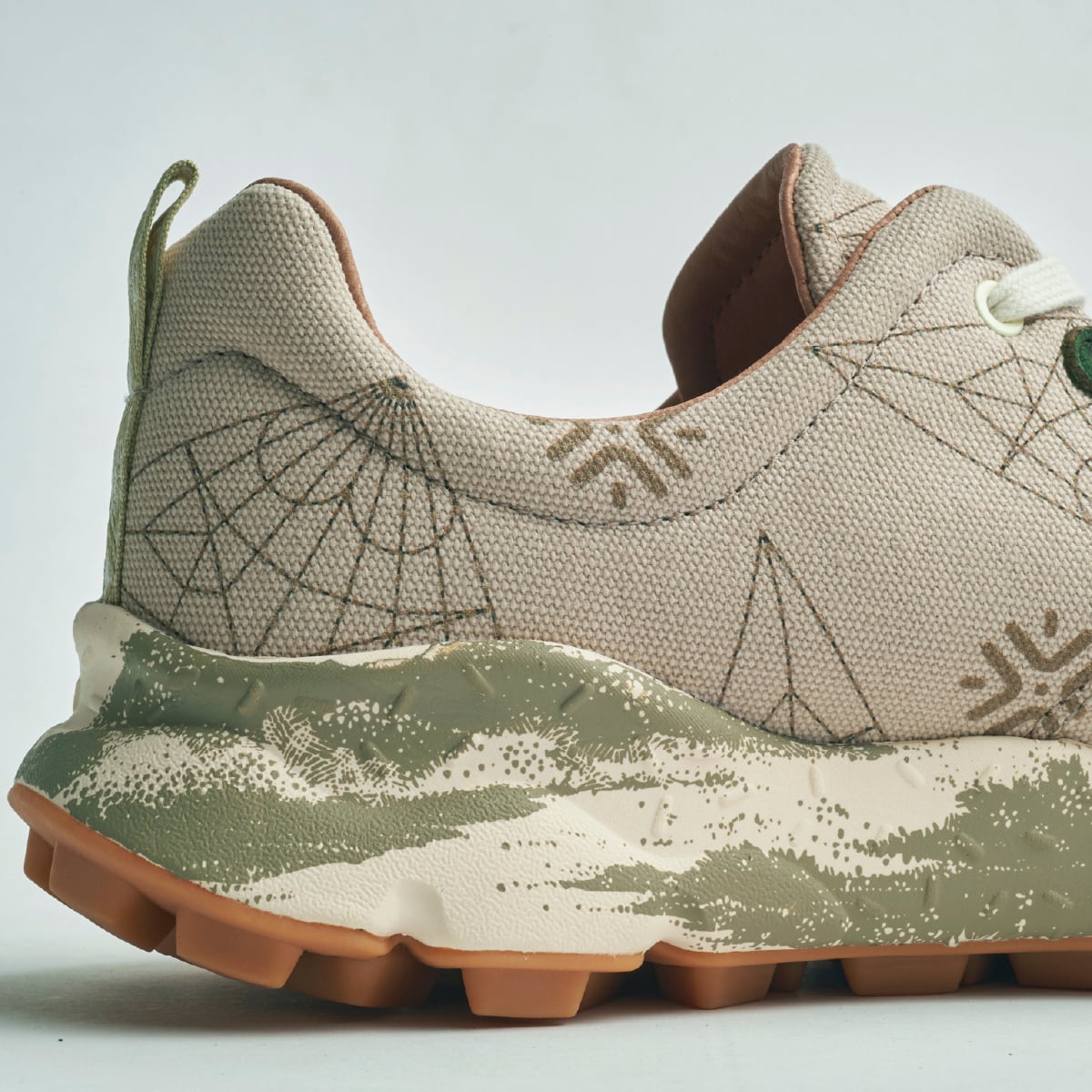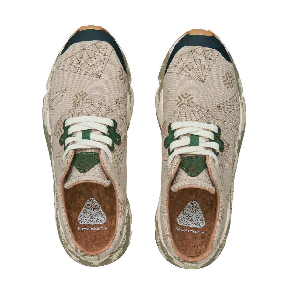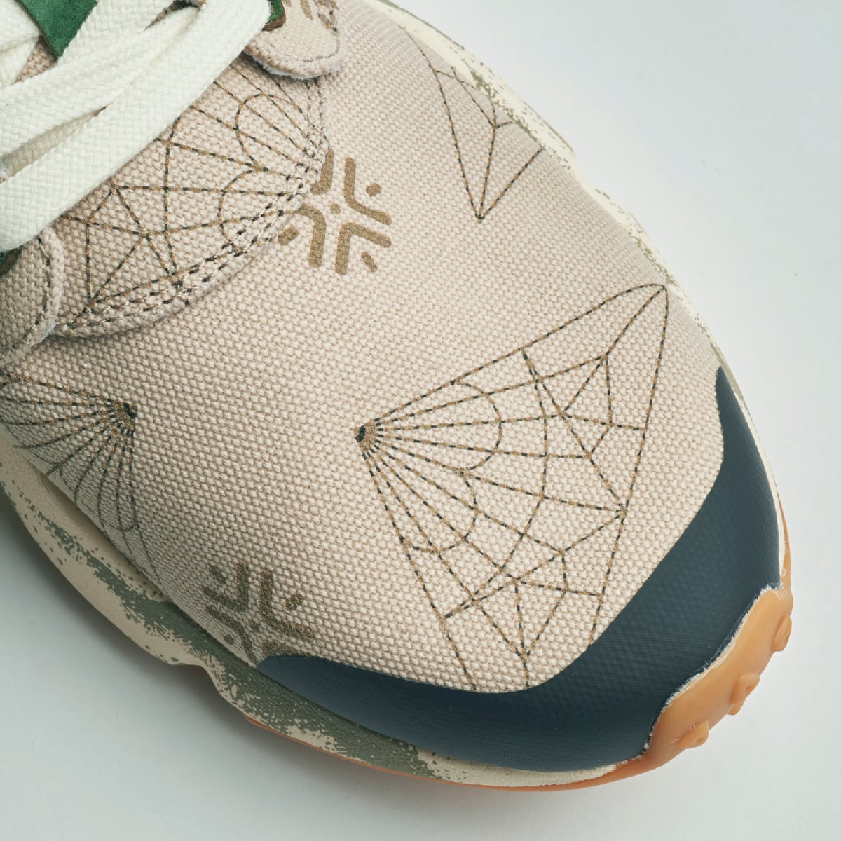 織鶴を広げた展開図をモチーフにした10周年記念のマーク。アッパーにはその印象的なパターンが大胆にプリントされている。