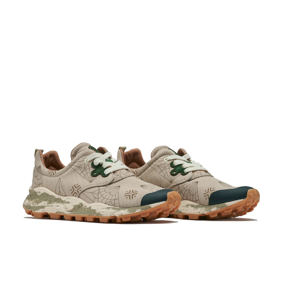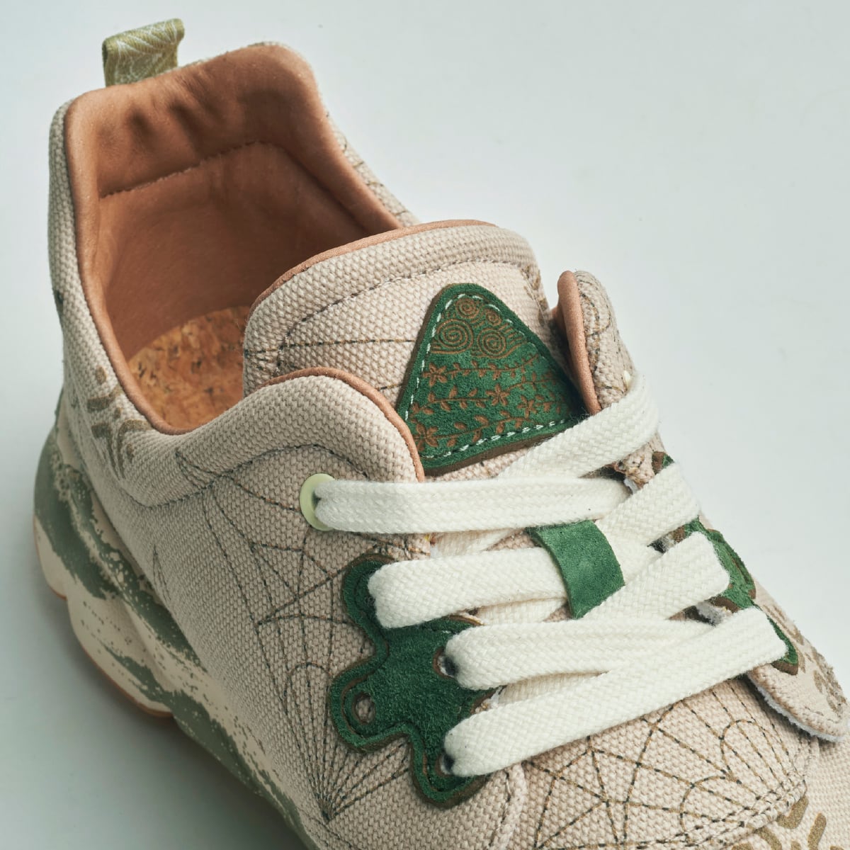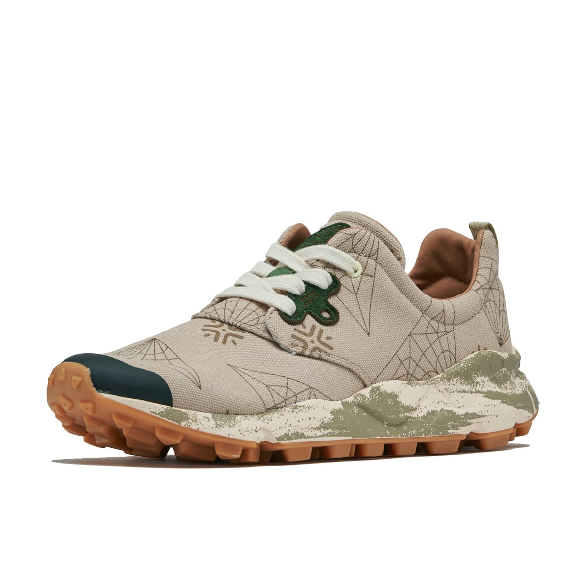 織鶴を広げた展開図をモチーフにした10周年記念のマーク。アッパーにはその印象的なパターンが大胆にプリントされている。