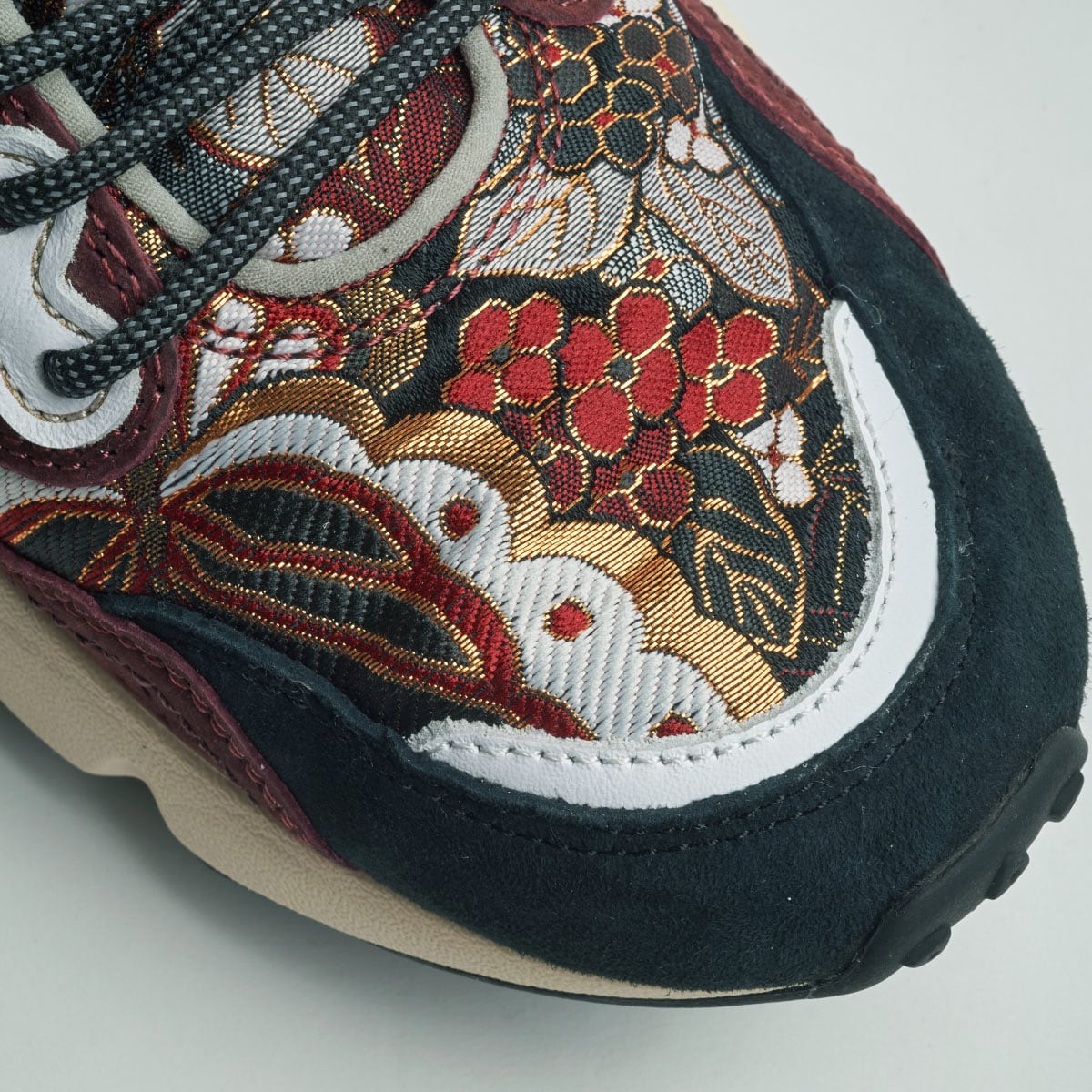 日本における自然美の象徴 “白桜”、蘇州に受け継がれる繊細な工芸美 “翠汕頭”、そして永遠の想いを託す “蝶”。それぞれのモチーフの西陣織をスニーカーボディに使用。