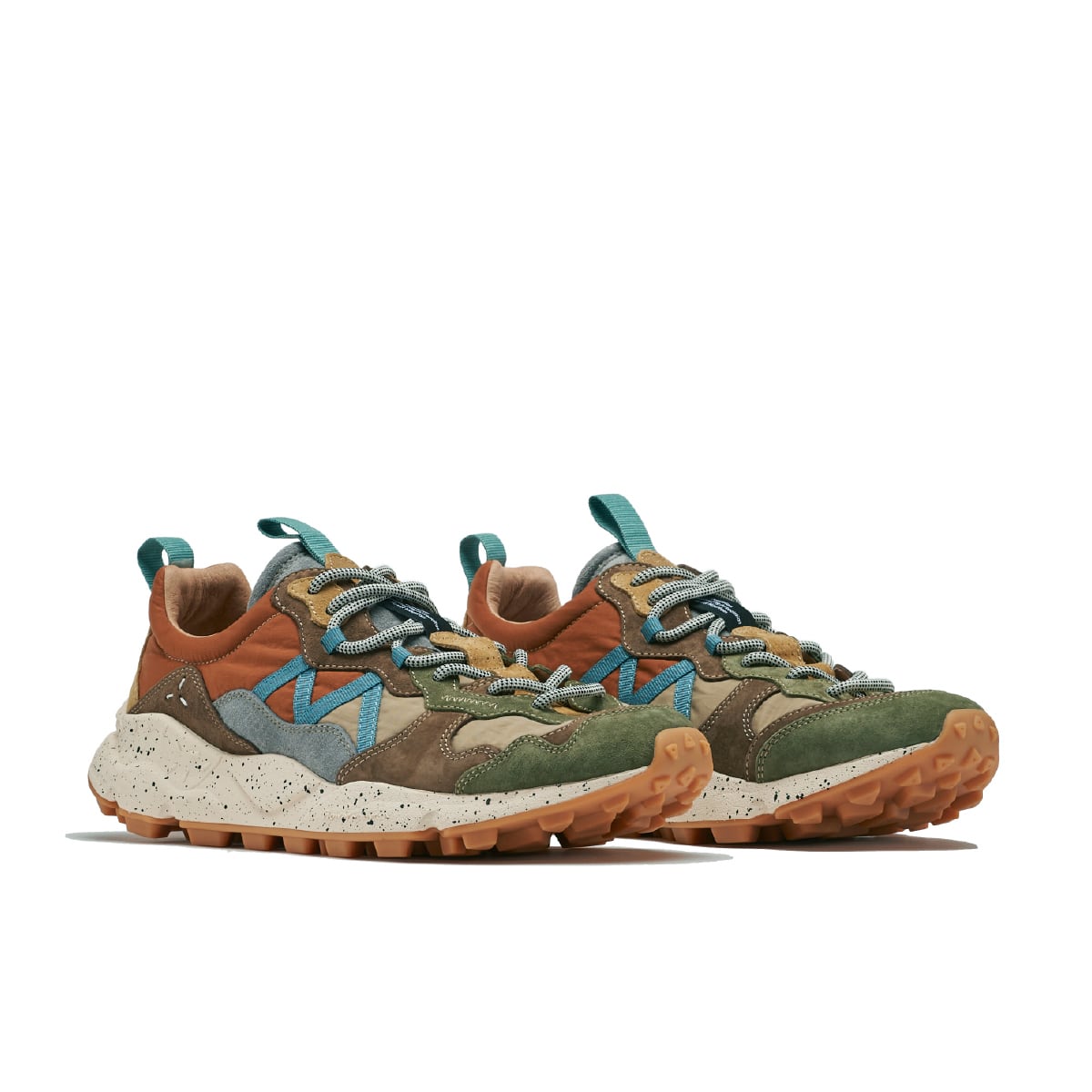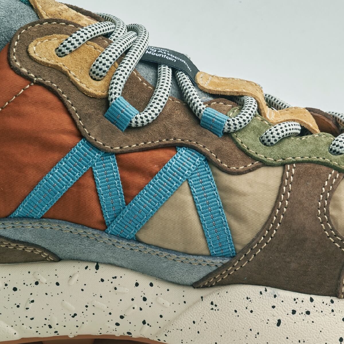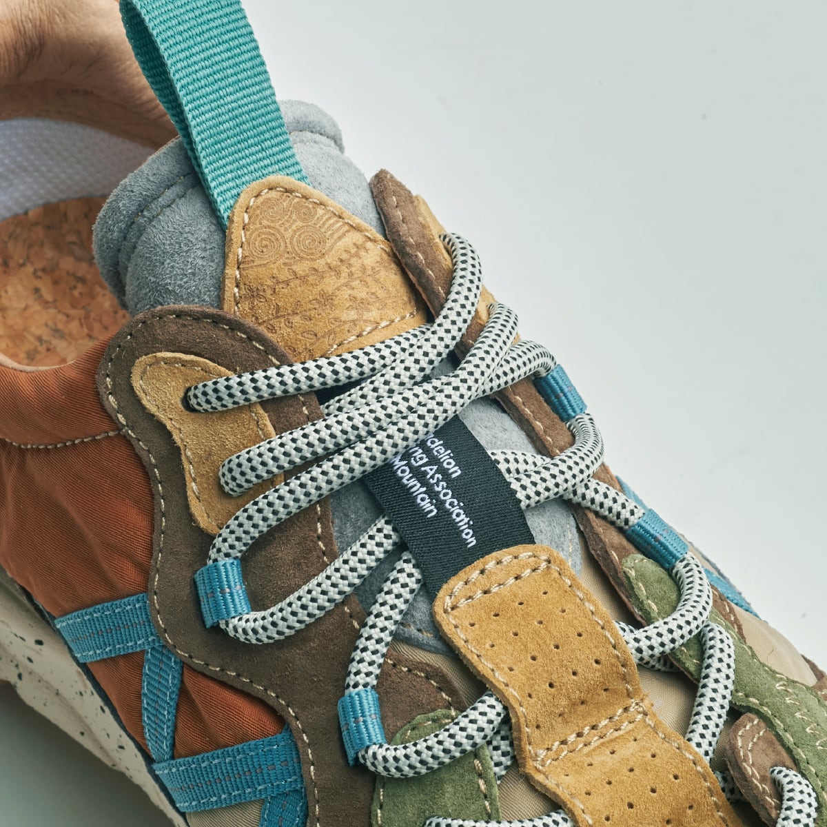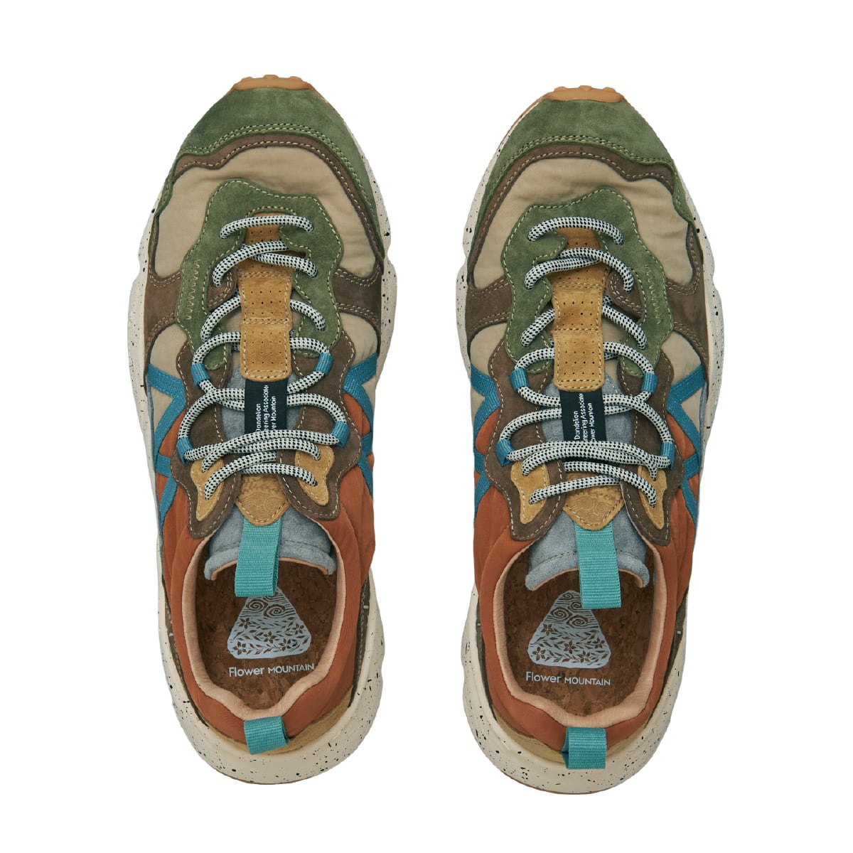 Flower MOUNTAINらしい有機的な曲線が幾重にも重なり生まれる、流れるようなフォルム。2つのパーツが融合したアイレットステイに象徴される、クラフト感あふれる装飾的なディテール。クッション性に優れたソールや、抗菌・防臭機能などの実用性も備える。