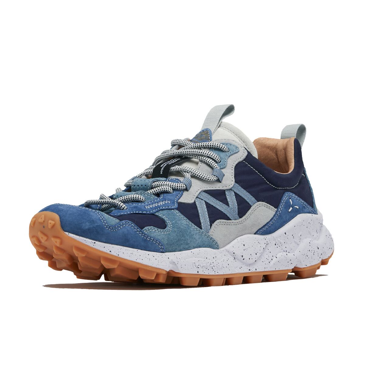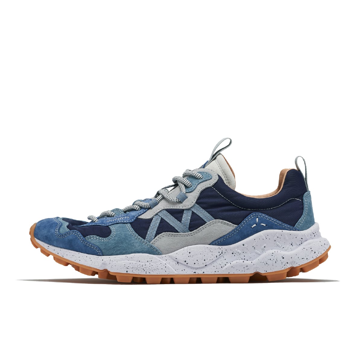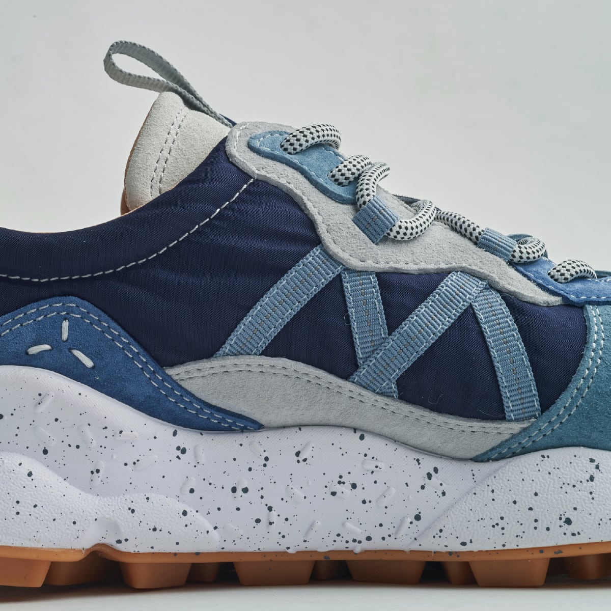 Flower MOUNTAINらしい有機的な曲線が幾重にも重なり生まれる、流れるようなフォルム。2つのパーツが融合したアイレットステイに象徴される、クラフト感あふれる装飾的なディテール。クッション性に優れたソールや、抗菌・防臭機能などの実用性も備える。
