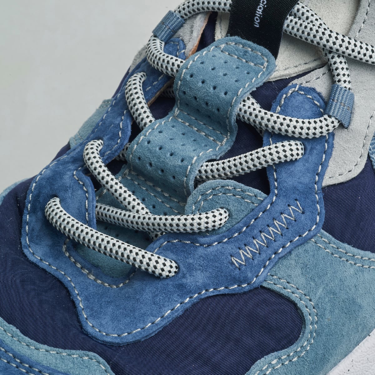 濃いネイビーのボディにブルーグラデーションのオーバーレイを合わせた涼し気で上品なイメージの一足。