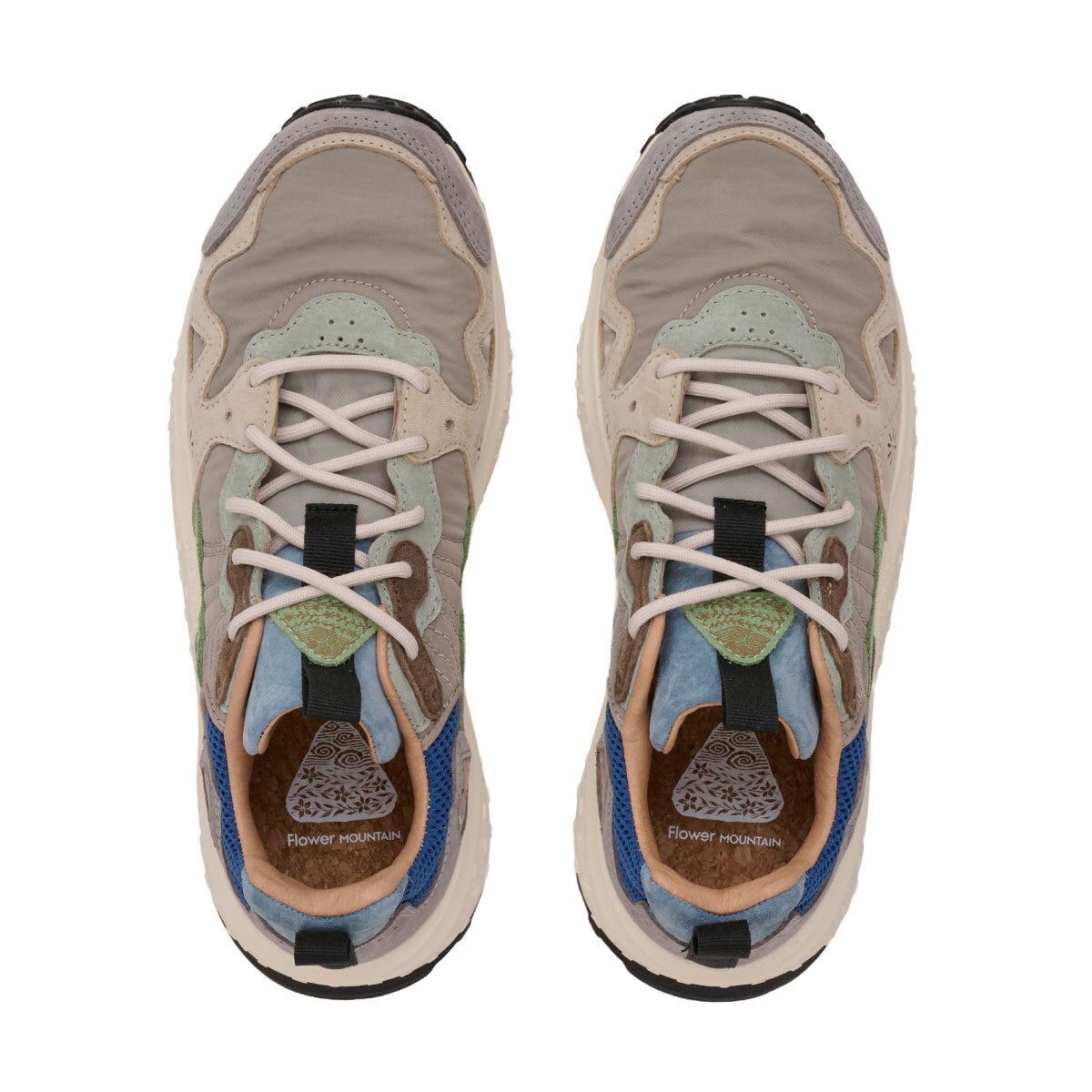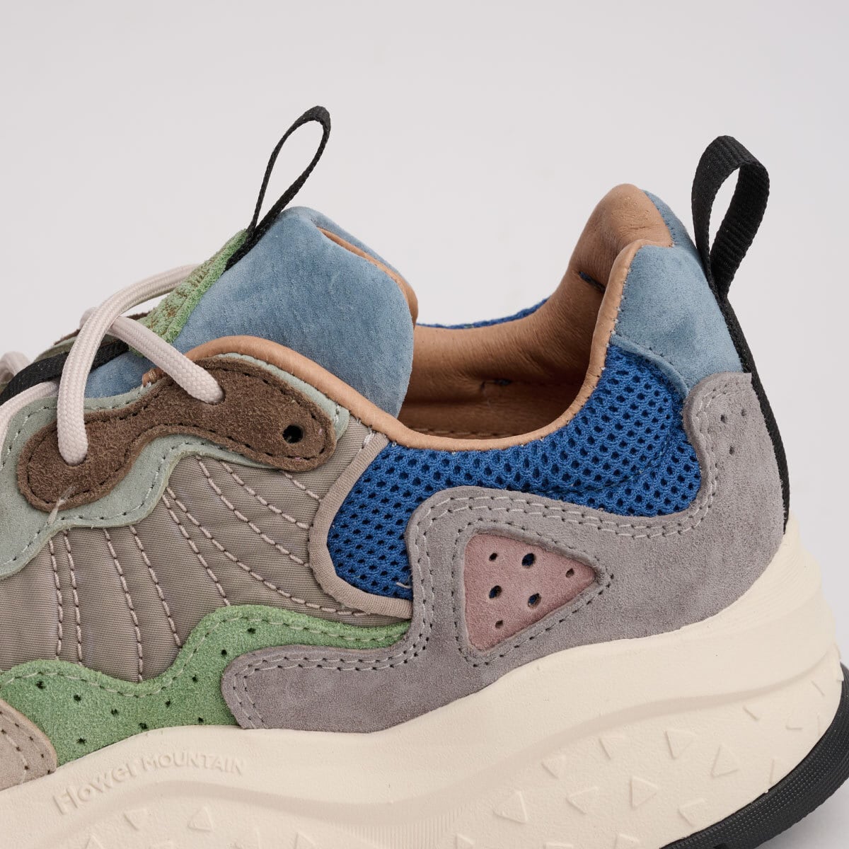 全体として、まるでひとつの生命体のような存在感を放つ、フラワーマウンテンらしいデザイン表現が際立つ一足。多層構造のアイレットステイと補強ステッチにより安定性を高め、快適で軽やかなフィット感を実現している。