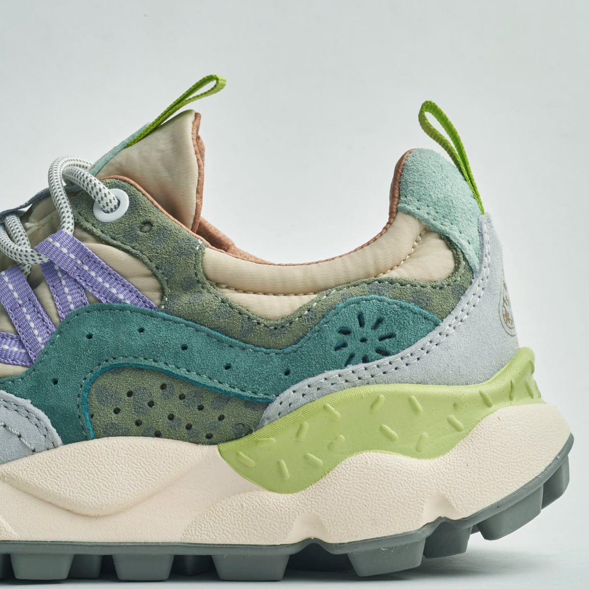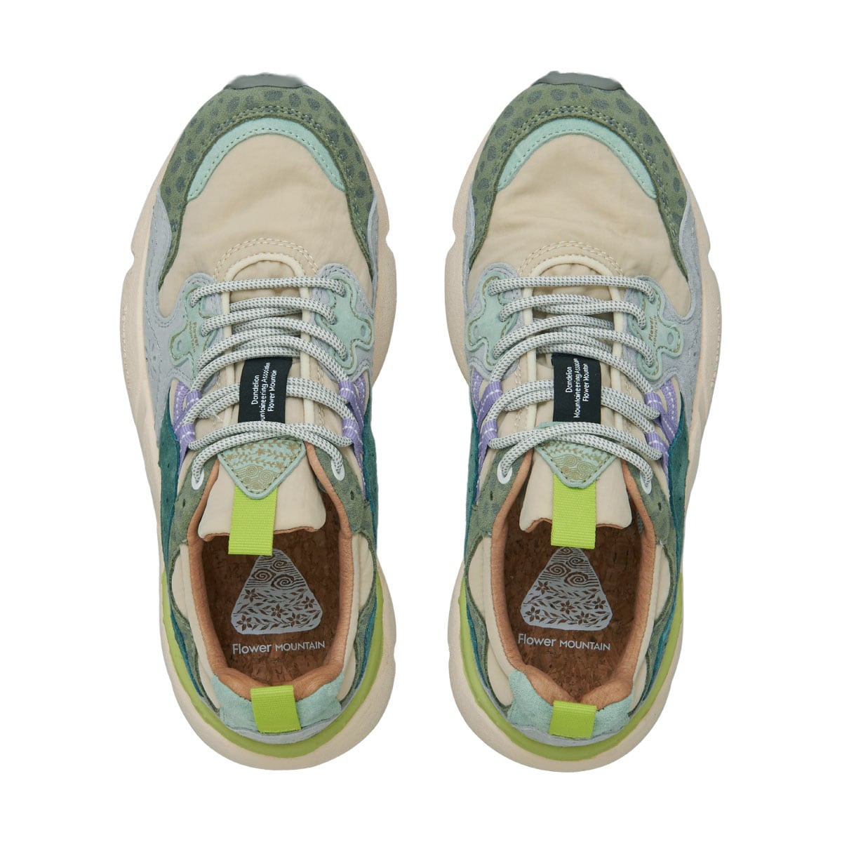 グリーンとグレーの濃淡からなるグラデーションをレイヤーごとに配し、差し色としてサイドテープに淡いパープルを採用。夏の暑さの中においても涼しさを感じさせる。
