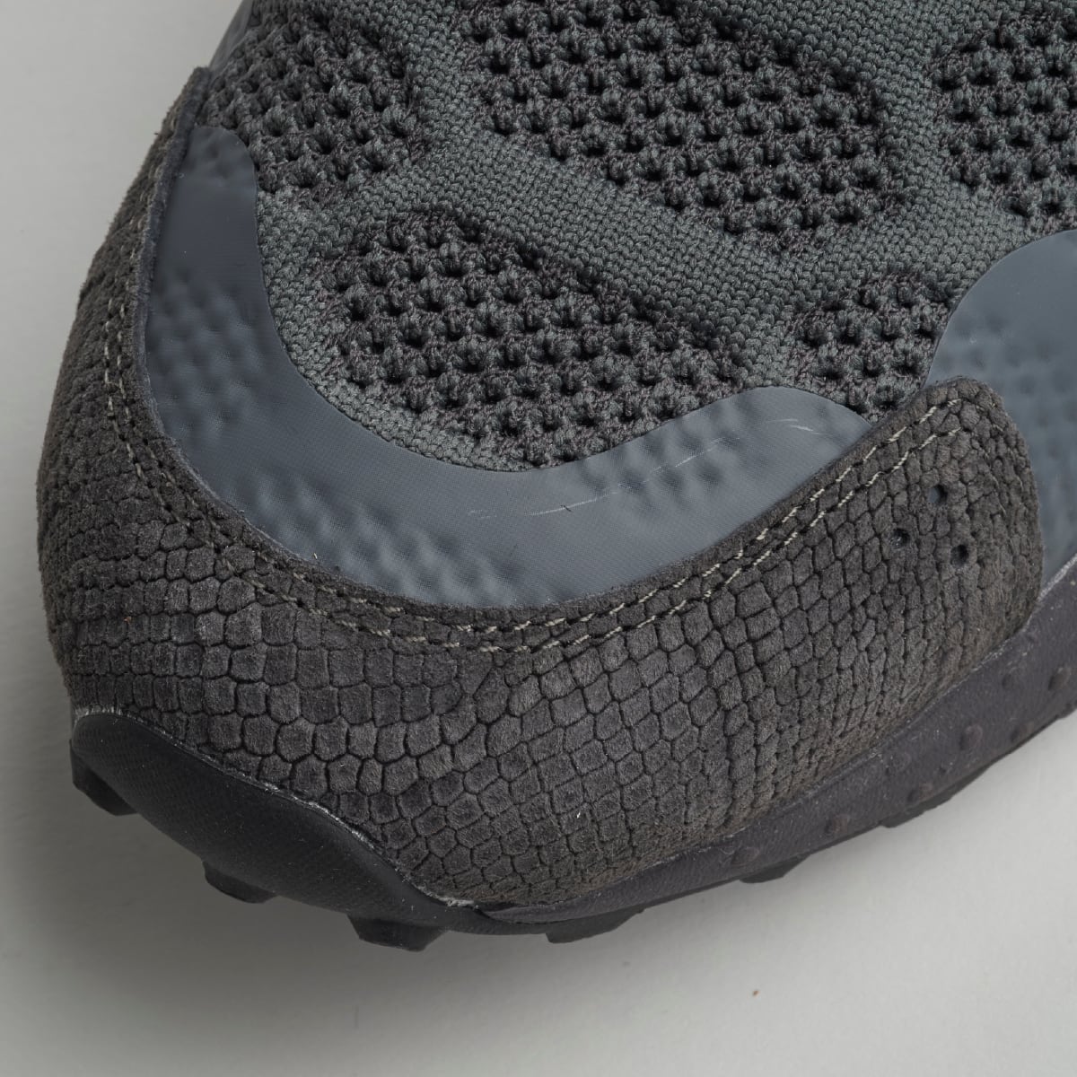 アッパーのメッシュ素材は伸縮性・形状の安定と通気性に優れ、足を包み込むようなフィッティングと快適性を持つ。