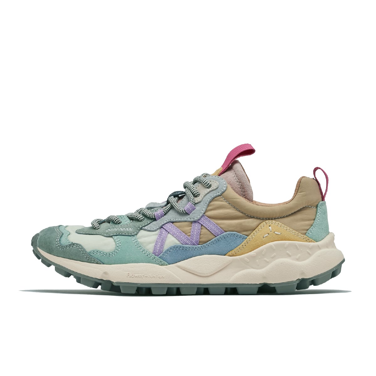 Flower MOUNTAINらしい有機的な曲線が幾重にも重なり生まれる、流れるようなフォルム。2つのパーツが融合したアイレットステイに象徴される、クラフト感あふれる装飾的なディテール。クッション性に優れたソールや、抗菌・防臭機能などの実用性も備える。