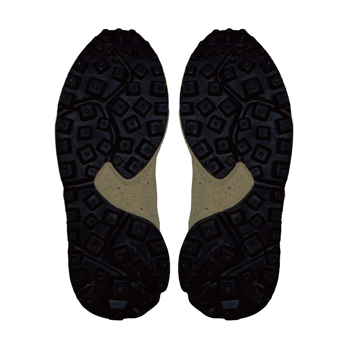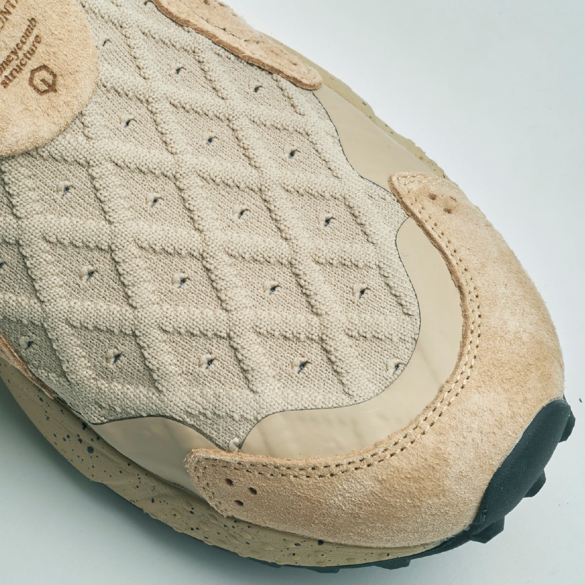 アッパーのメッシュ素材は伸縮性・形状の安定と通気性に優れ、足を包み込むようなフィッティングと快適性を持つ。